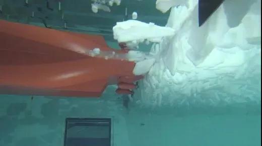 通過(guò)先后兩次的冰模試驗(yàn),全面測(cè)試了在北極航行船只的破冰工況,包含中厚陳年冰航道開(kāi)辟試驗(yàn)、航道突破試驗(yàn)、流冰試驗(yàn)和冰脊穿越試驗(yàn)。