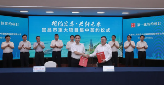 7月28日,中國船舶集團有限公司黨組成員、副總經理錢建平代表中國船舶集團與宜昌市政府簽訂了《中國船舶(宜昌)海洋裝備科技園項目框架合作協議》。宜昌市委書記周霽、市長張家勝參加簽約活動。