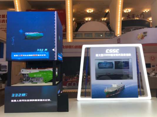 進入中國船舶展廳,觀眾不僅能夠看到“奮斗者”號全海深載人潛水器、“雪龍2”號極地科考船等多個高科技品牌產(chǎn)品,還可以通過航空母艦、常規(guī)動力潛艇、驅(qū)逐艦、護衛(wèi)艦?zāi)P土私馕覈鴩姥b備實力。
