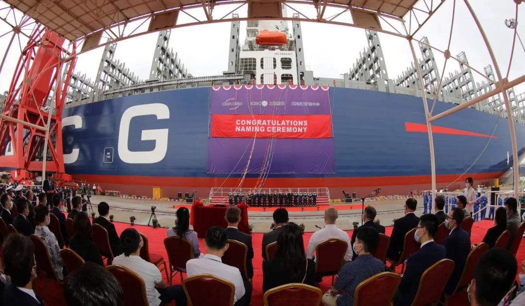8月27日,由中國船舶集團有限公司旗下滬東中華聯(lián)合中船貿(mào)易為法國達飛海運集團建造的15000TEU超大型集裝箱系列船首制船“達飛·和風”號命名交付。這是中法兩國船海巨頭全面落實2019年中國國家主席習近平和法國總統(tǒng)馬克龍見證簽署的戰(zhàn)略合作框架協(xié)議的最新成果。同時,也標志著“CSSC超大型箱船譜系”又添“新丁”,實現(xiàn)了對全球超大型集裝箱船發(fā)展的引領(lǐng)。