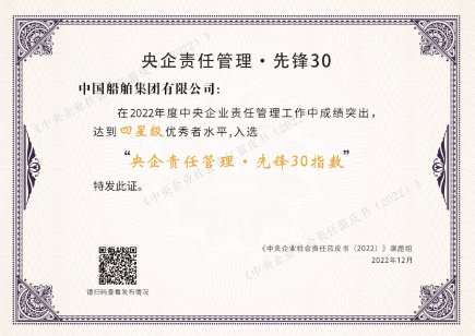 2022年12月20日,由國務院國資委社會責任局主辦、中國社會責任百人論壇承辦的“新征程 新責任——《中央企業(yè)社會責任藍皮書(2022)》《國資國企社會責任藍皮書(2022)》發(fā)布活動”在京舉行。活動以“云端會議”的方式舉辦,發(fā)布了“央企責任管理 · 先鋒30指數(shù)”,中國船舶集團入選該指數(shù)。