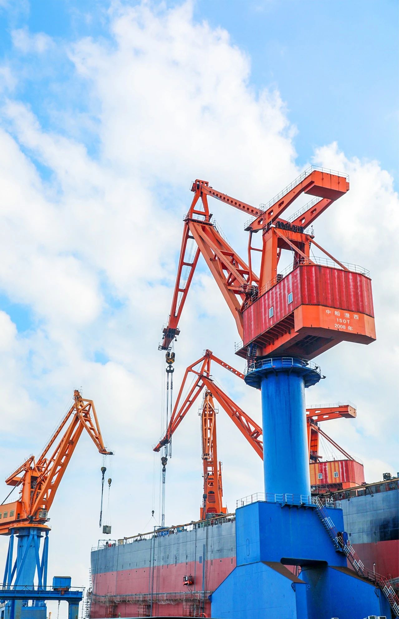 本幅作品拍攝于中船澄西主建船型82000噸散貨船船臺搭載過程中,高矮錯落的吊臂構(gòu)成了如音符一般的工作樂潮。