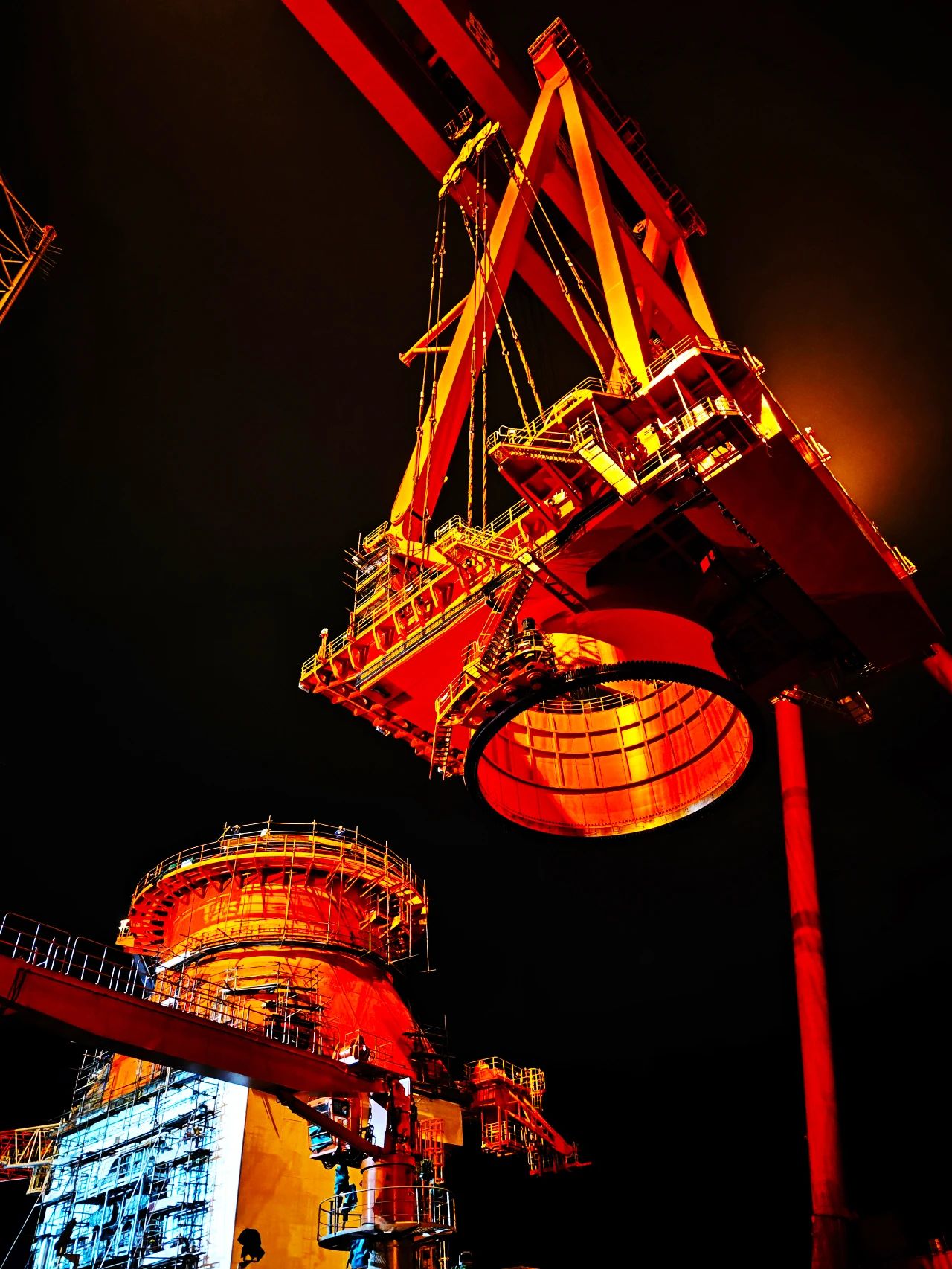 在武漢船機平臺總裝現(xiàn)場,華夏金租神大平臺配套的1200噸起重機正在安裝,大件吊裝各項準(zhǔn)備工作繁瑣,一切就緒時,天已經(jīng)黑了,現(xiàn)場一鼓作氣開始吊裝對接,展現(xiàn)了船舶人只爭朝夕、不負(fù)韶華、忘我工作精神風(fēng)貌。