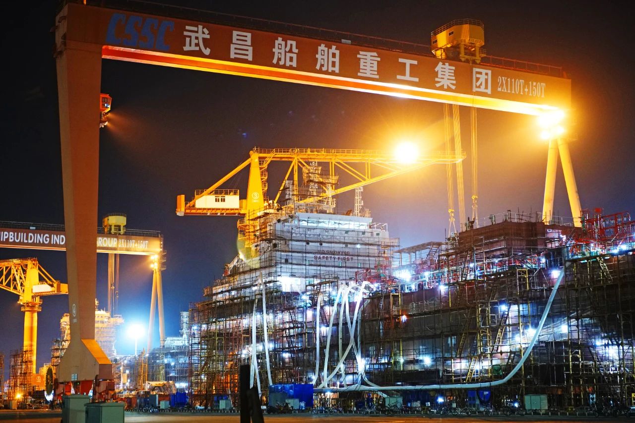 照片攝于國產(chǎn)首艘大型郵輪首次出塢前夕,拍攝時期為傍晚,船塢開啟燈光照明,工人在對船身做最后的涂裝修飾工作。這樣的角度觀看國產(chǎn)首艘大型郵輪令人無比震撼。