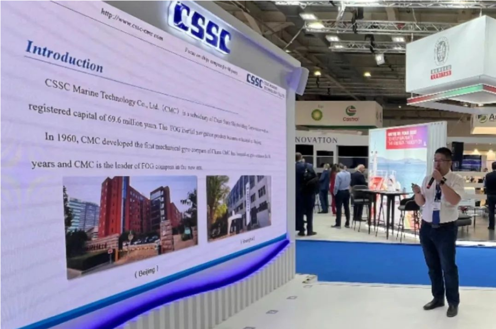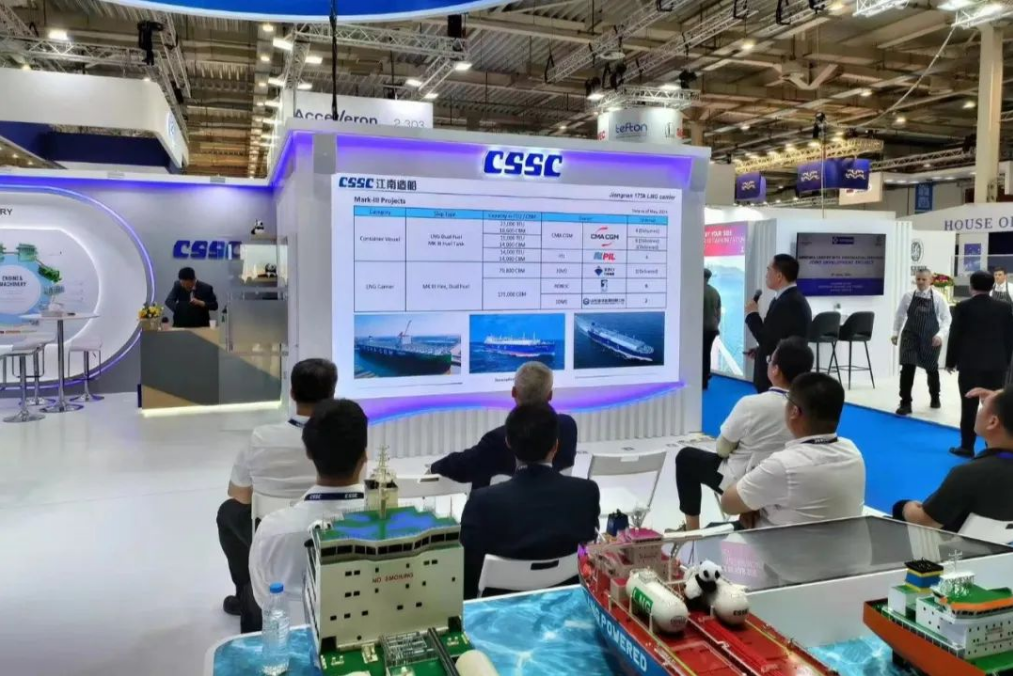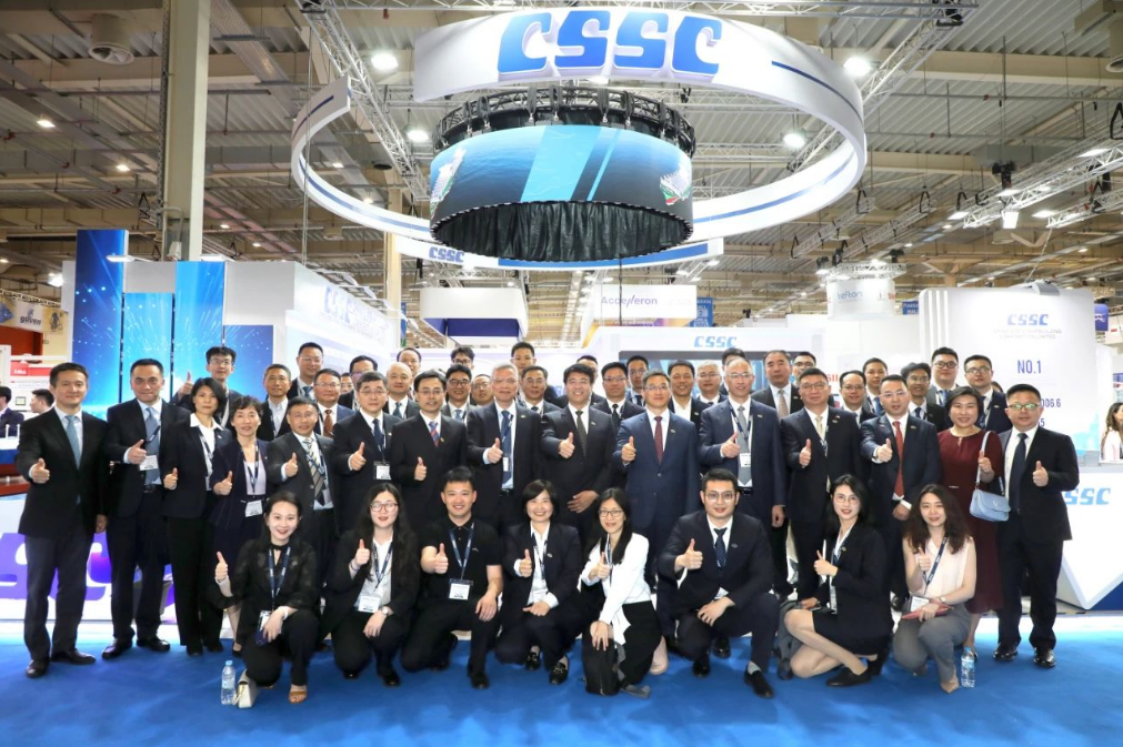 此次展會(huì),中國(guó)船舶集團(tuán)攜旗下19家成員單位參展,有關(guān)成員單位負(fù)責(zé)人率隊(duì)赴展會(huì)開展重點(diǎn)船海項(xiàng)目經(jīng)營(yíng)洽談并拜訪當(dāng)?shù)睾椭苓厙?guó)家客戶。集團(tuán)公司以“共贏未來”為參展主題,設(shè)置集團(tuán)總體區(qū)、綠色航運(yùn)解決方案區(qū)、低碳環(huán)保配套設(shè)備區(qū)共3個(gè)展示區(qū)域,重點(diǎn)展示了135500總噸大型郵輪、175000方LNG運(yùn)輸船、24000箱超大型集裝箱船、210000噸氨燃料散貨船、LNG雙燃料VLCC等一系列高技術(shù)、高附加值明星產(chǎn)品,以及CPGC-WinGD 10X92DF-M甲醇雙燃料發(fā)動(dòng)機(jī)、船用碳捕捉系統(tǒng)等全球船東高度關(guān)注的綠色低碳配套設(shè)備。同時(shí),通過展臺(tái)上醒目的品牌標(biāo)識(shí)、層級(jí)化的品牌體系圖、富有感染力的品牌推介視頻,首次面向全球客戶,立體化展示“中國(guó)船舶”品牌及下屬企業(yè)品牌和產(chǎn)品品牌體系,進(jìn)一步強(qiáng)化了集團(tuán)公司品牌形象。
