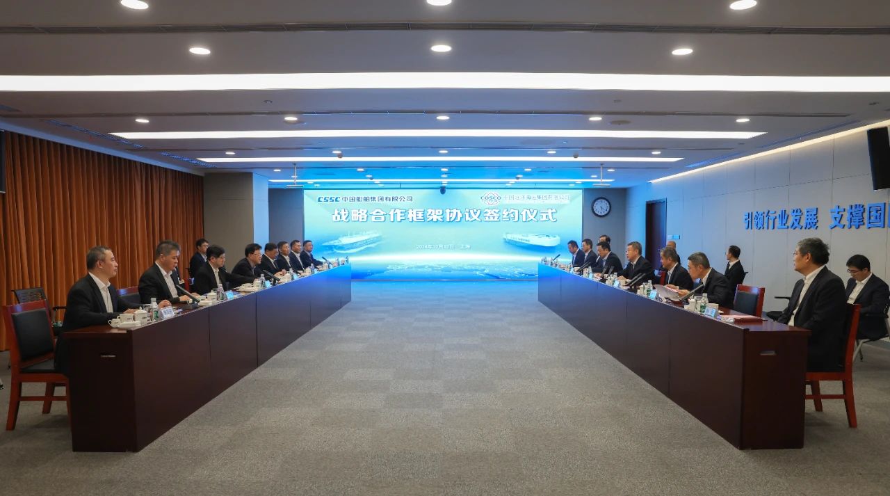 10月15日,中國船舶集團有限公司與中國遠洋海運集團有限公司在上海簽訂戰(zhàn)略合作框架協(xié)議。中國船舶集團黨組書記、董事長溫剛,中遠海運集團黨組書記、董事長萬敏,黨組副書記、總經(jīng)理朱碧新出席簽約儀式。中國船舶集團黨組成員、副總經(jīng)理盛紀綱,紀檢監(jiān)察組組長、黨組成員彭宏,中遠海運集團黨組成員、副總經(jīng)理、總會計師孫云飛出席簽約儀式。盛紀綱和孫云飛分別代表雙方在協(xié)議上簽字。簽約前,雙方就進一步加強溝通交流、深化多領域合作進行了交流探討。