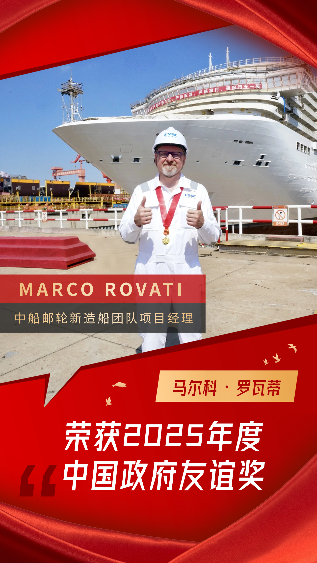 MARCO ROVATI是一位出生于1967年的克羅地亞籍郵輪工程專家,擁有超過三十年的郵輪新造船經驗。在獲得中國政府友誼獎后,MARCO ROVATI說:“中國政府友誼獎是我職業生涯中獲得的最重要的榮譽,對我而言具有非凡意義。這份獎項不僅是對我過去工作的認可,更是對我未來的激勵。我將繼續為中國郵輪產業的發展貢獻自己的力量?!?/p>