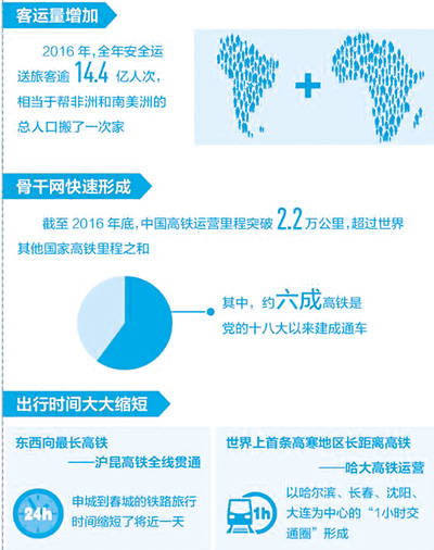 編織一張密度適宜的高鐵網(wǎng)絡(luò),造福盡可能多的民眾。十八大以來,我國高鐵版圖不斷延伸:2013年7月,穿越江南水鄉(xiāng)的寧杭高鐵開通;2014年6月,世界上一次性建成通車?yán)锍套铋L的高速鐵路蘭新高鐵建成通車;2016年12月,滬昆高鐵全線通車,彩云之南不再“邊緣”。截至2016年底,中國高鐵運(yùn)營里程突破2.2萬公里,超過世界其他國家高鐵里程之和,除幾條線路外,2004年提出的“四縱四橫”高鐵網(wǎng)已全部建成。根據(jù)2016年7月新修訂的國家《中長期鐵路網(wǎng)規(guī)劃》(2016-2030年),預(yù)計到2020年,全國高速鐵路將增加到3萬公里。今年繼續(xù)保持高鐵網(wǎng)絡(luò)快速建設(shè)勢頭,就在上月初,寶蘭高鐵通車,將使千年絲路煥發(fā)更加蓬勃的生機(jī)。不久后,我們還將見證張呼客專馳騁于遼闊的大草原,而西成高鐵也將讓千年蜀道不再艱難。