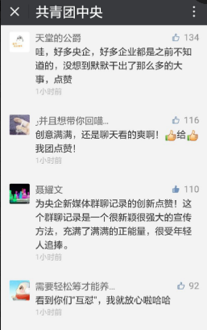 “‘央企新媒體群聊記錄’刷屏是央企新媒體親民傳播風格的正向反饋,能引發(fā)受眾共鳴的話題加上激發(fā)和感染的受眾,從而引發(fā)了積極的再傳播力量”,人民網(wǎng)輿情監(jiān)測室常務(wù)副秘書長單學剛同樣不諱受眾在其中的作用。