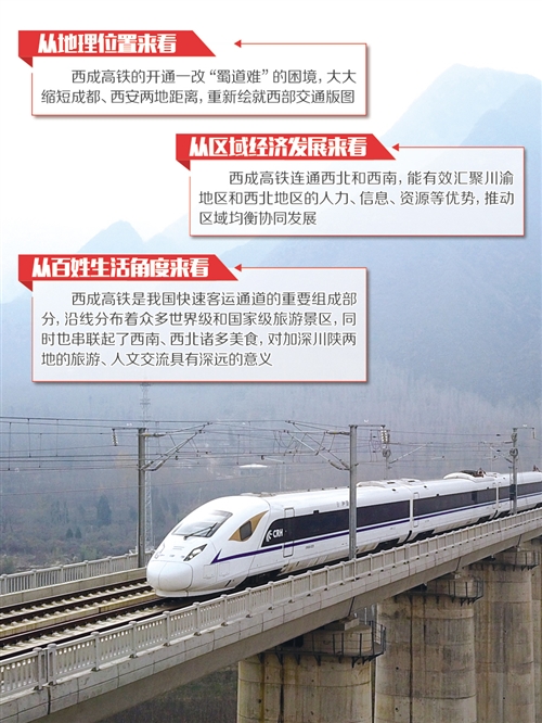 從地理位置來看,西成高鐵將一改“蜀道難”的困境,大大縮短成都、西安兩地距離,重新繪就西部交通版圖。從區(qū)域經(jīng)濟(jì)發(fā)展來看,西成高鐵連通西北和西南,能有效匯聚川渝地區(qū)和西北地區(qū)的人力、信息、資源等優(yōu)勢,推動(dòng)區(qū)域均衡協(xié)同發(fā)展。從百姓生活角度來看,西成高鐵是我國快速客運(yùn)通道的重要組成部分,沿線分布著眾多世界級和國家級旅游景區(qū),對加深川陜兩地的旅游、人文交流具有深遠(yuǎn)的意義。