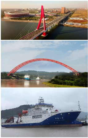 ????上圖所示均為武船集團(tuán)承建的項目。圖1:遼寧盤錦遼濱沿海經(jīng)濟(jì)開發(fā)區(qū)大橋;圖2:四川合江長江一橋;圖3:我國自主研制的第一艘載人潛水器支持母船“深海一號”。