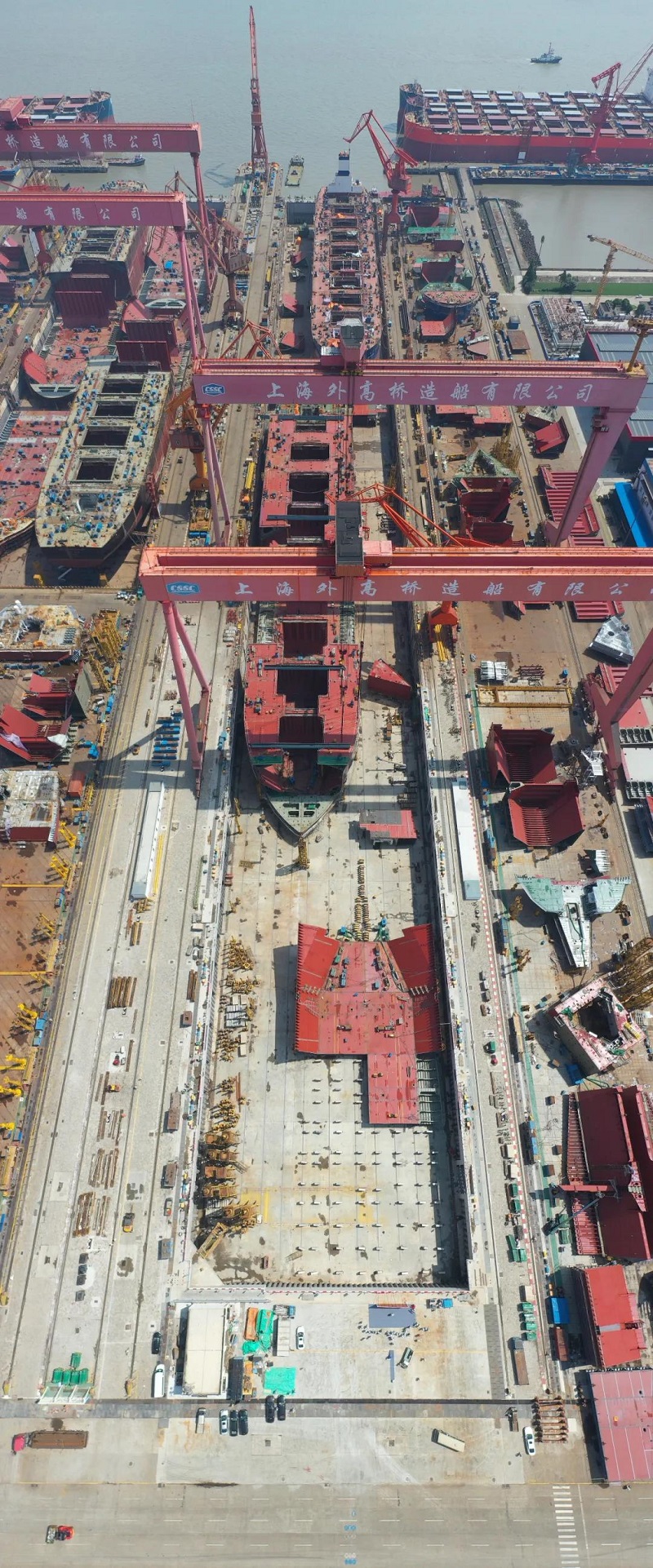 該項(xiàng)改造工程是將現(xiàn)有船塢從540米向陸側(cè)延伸200米,形成長(zhǎng)740米、寬76米的“巨無(wú)霸”船塢,其周長(zhǎng)達(dá)到1.632千米,面積相當(dāng)于7個(gè)標(biāo)準(zhǔn)足球場(chǎng),能同時(shí)滿(mǎn)足1艘大型郵輪總組、1艘大型郵輪舾裝的需求,達(dá)到年產(chǎn)1艘半大型郵輪的建造要求。