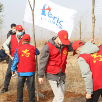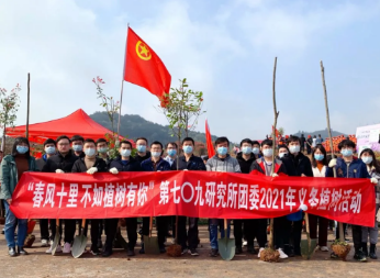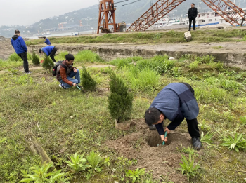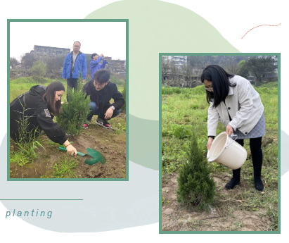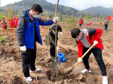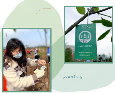 大家揮鍬鏟土、扶植樹苗、培土踩實