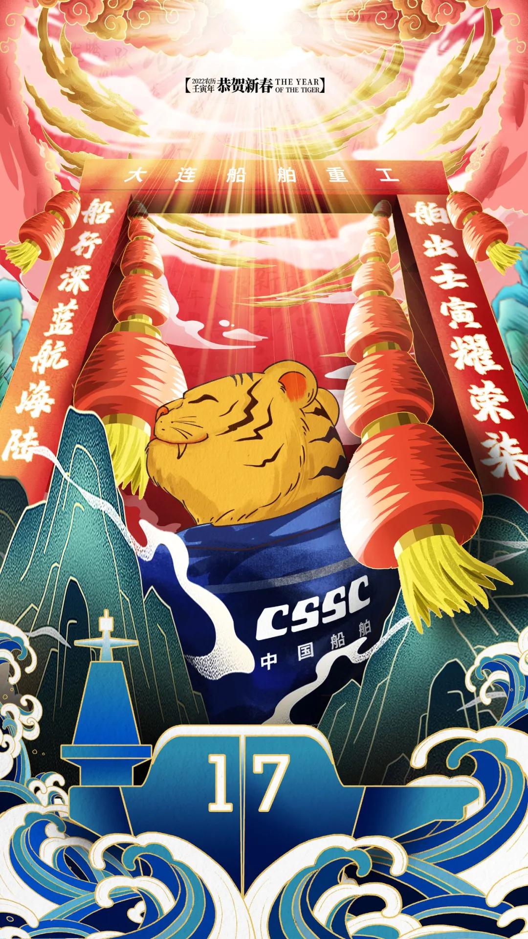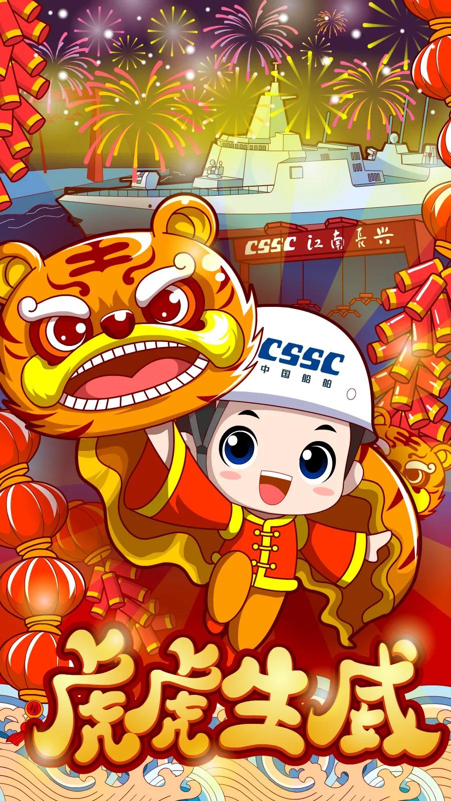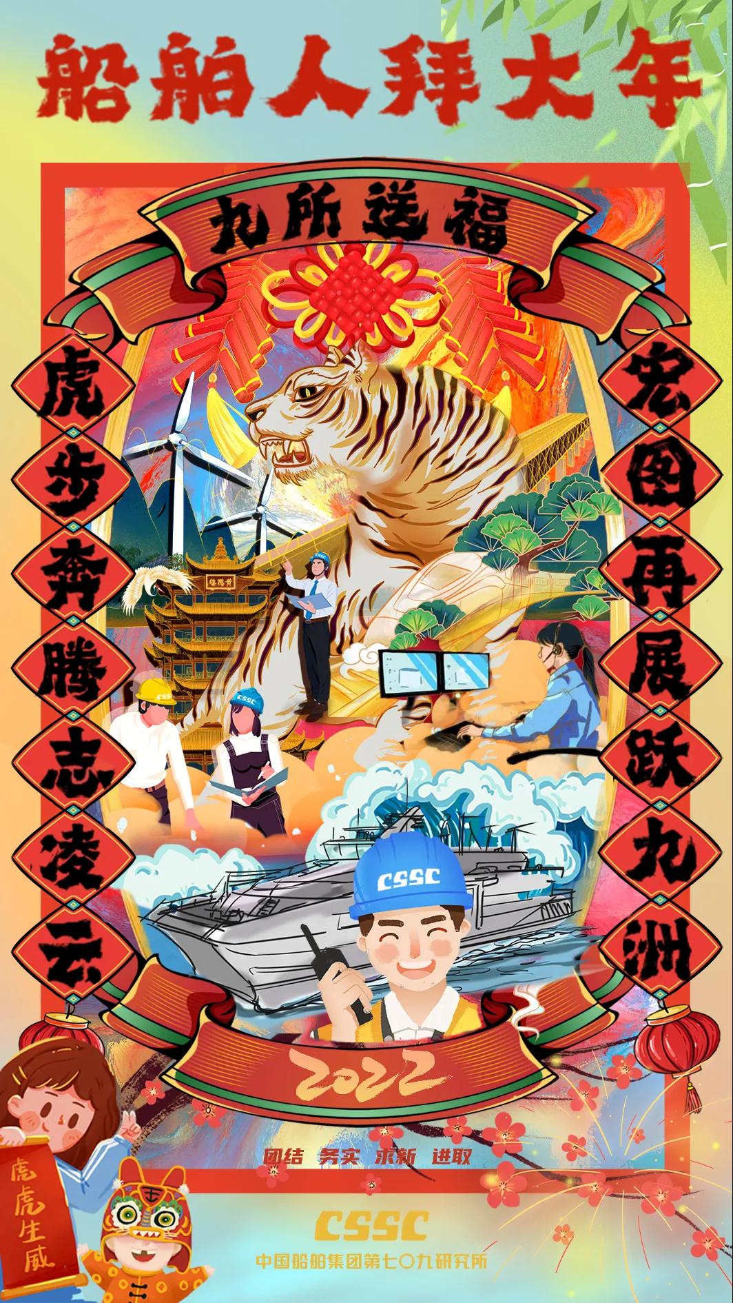 海報采用國潮畫風,中間部分“江小南”穿著新衣舉著虎頭,寓意新的一年中國船舶人虎虎生威,上面部分以重要產(chǎn)品和廠區(qū)設(shè)備為主,詮釋江南造船建造國之重器的初心和使命,同時輔以鞭炮、煙花、燈籠等新年元素,使海報充滿喜慶祥和的新年氛圍。