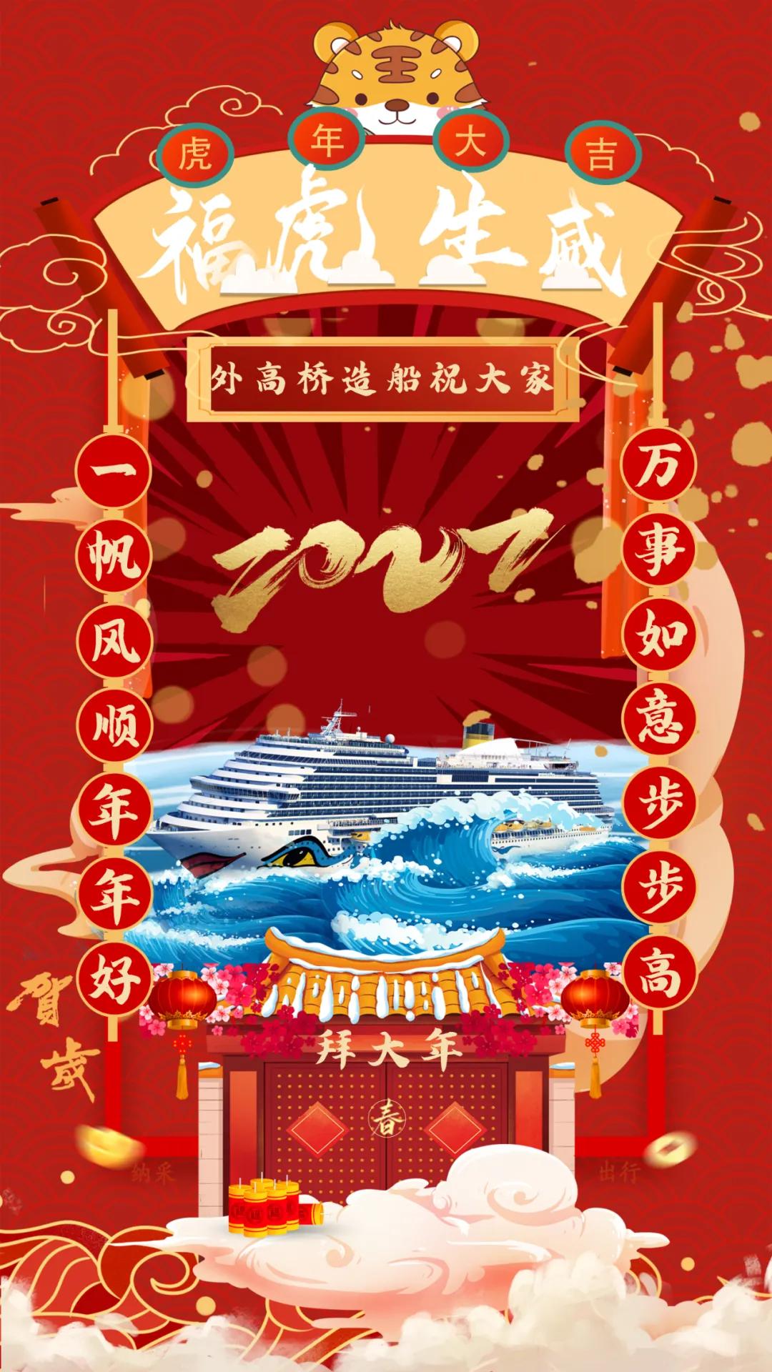 以門為前景,郵輪在海上乘風破浪,寓意中國首制大型郵輪建造能取得開門紅!以紅色為背景,表達新年喜慶的節(jié)日氛圍,也祝福祖國郵輪產(chǎn)業(yè)的發(fā)展紅紅火火,蒸蒸日上!