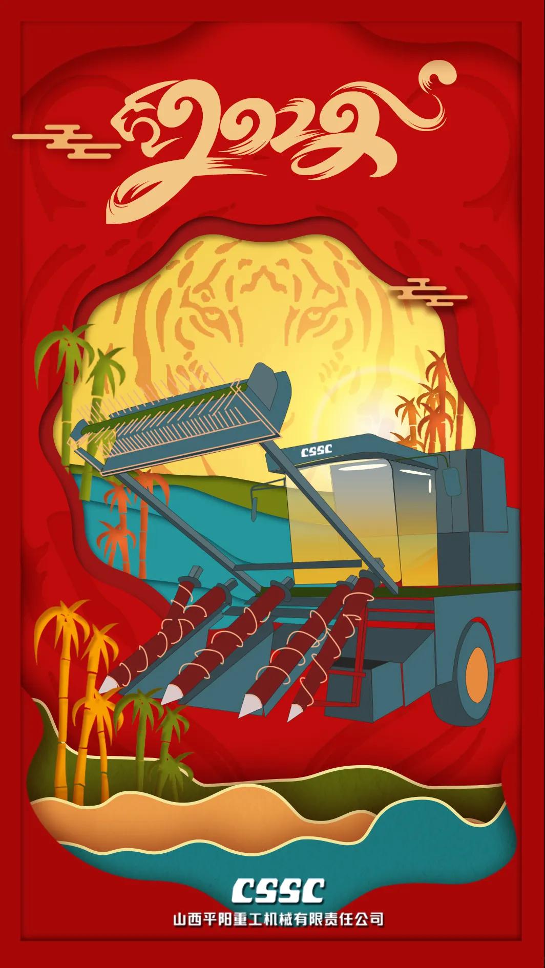 海報采用剪紙風格,層層遞進的縱深感傳遞著平陽人不斷探索創(chuàng)新的拼搏精神;海報主體為平陽重工新產(chǎn)品——甘蔗收獲機,展示著平陽風采;海報以“虎紋”為背景,以紅色為主色調(diào),烘托出虎年的喜慶氛圍。