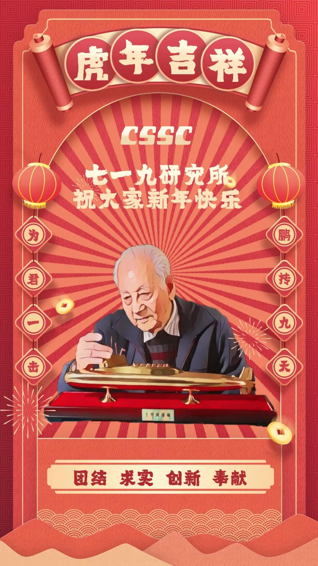 節(jié)日的煙花詮釋喜慶,大紅的燈籠點亮祝福!黃旭華院士作為七一九所典型人物代表,認真注視著他為之奉獻一生的艇,也反映了這條戰(zhàn)線上科技工作者們“團結(jié)、求實、創(chuàng)新、奉獻”的工作作風。“為君一擊 鵬摶九天”暗藏“一九”二字,反映出七一九所肩負的責任之大,使命之重,表達了軍工人將船舶事業(yè)做大做強的決心。