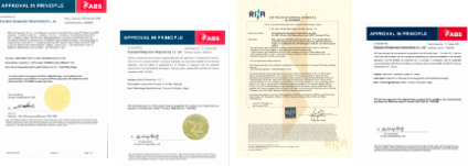 從左至右依次為21萬噸紐卡斯?fàn)栃图状既剂蟿恿ι⒇洿?200車雙燃料動力汽車運輸船(PCTC)、創(chuàng)新型30萬噸原油輪(VLCC)、115萬載重噸氨燃料油輪的AIP證書