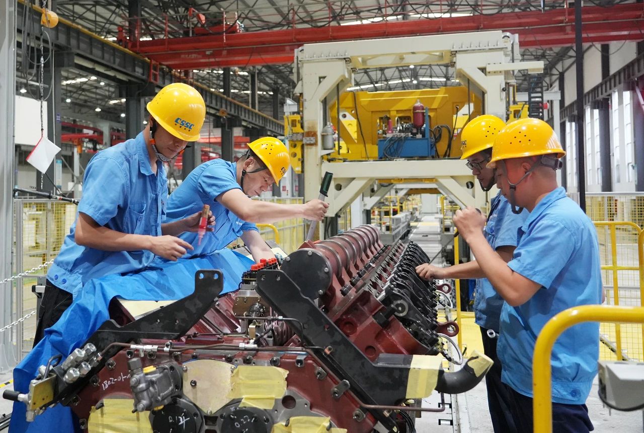 中船發動機——調試人員頂著高溫在認真安裝傳感器,汗水濕透了衣裳。