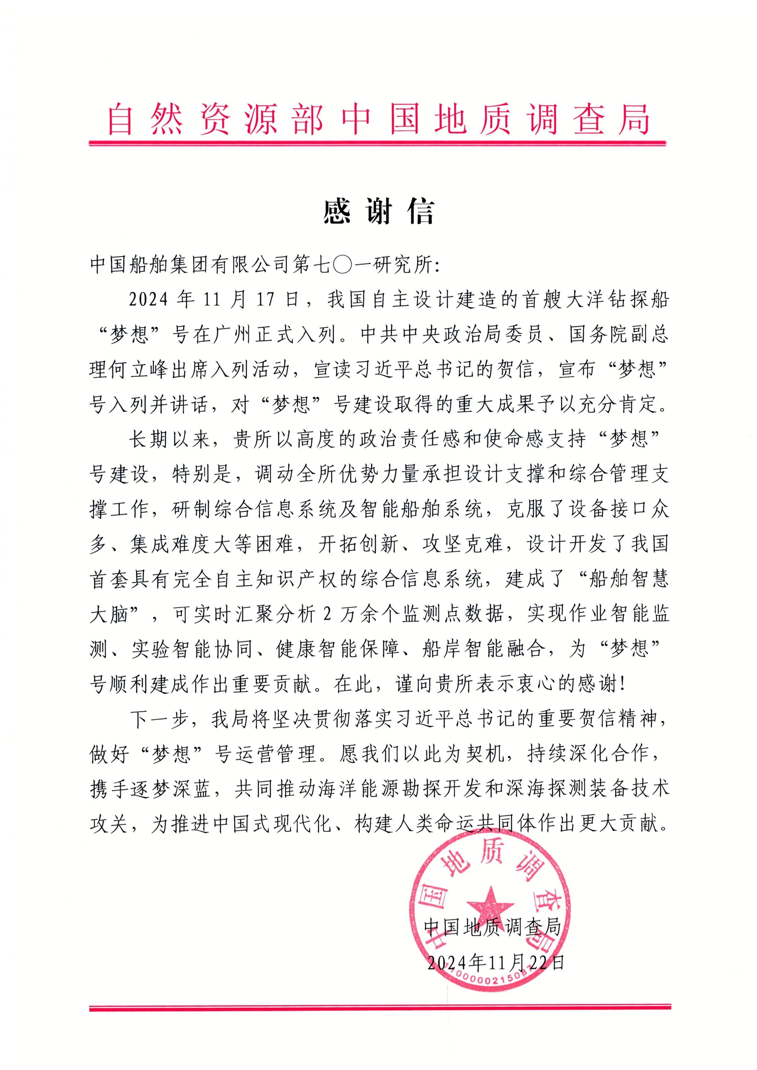 中國地質調查局在信中對中國船舶集團七〇一所在“夢想”號設計支撐和綜合管理支撐、綜合信息系統及智能船舶系統研制等方面所做的重要貢獻表示感謝。
