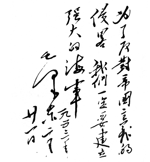 1953年2月19日,毛澤東在武漢登上長江艦視察長江中下游四省,并在長江艦上為海軍題詞:“為了反對帝國主義的侵略,我們一定要建立強大的海軍。”船未行至南京,毛澤東提出要在南京檢閱海軍戰(zhàn)艦。華東海軍立即抽調(diào)了“廣州”號和“南昌”號護衛(wèi)艦、“黃河”號登陸艦,以及101號、104號魚雷艇參加檢閱。幾天中,毛澤東連續(xù)5次都寫下同樣的題詞:“為了反對帝國主義的侵略,我們一定要建立強大的海軍”。這是中國領(lǐng)導(dǎo)人對建設(shè)強大海軍、建設(shè)一流裝備的殷切期望,是新生的中國對建設(shè)強大海防的決心。如今這顆刻著偉人囑托的銘石,靜靜矗立在江南造船長興島造船基地行政樓前的草坪,也靜靜地矗立在每一位江南人的心中。