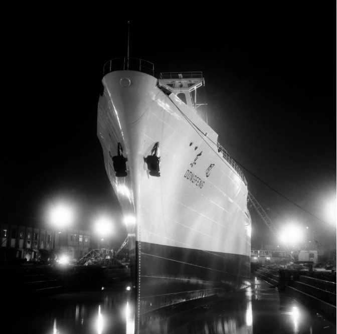 “一五”后期,研制萬噸級遠(yuǎn)洋貨船被列為國家新科技規(guī)劃的重點項目。在西方長期封鎖尤其是后來蘇聯(lián)中止援助的困難局勢下,“東風(fēng)”號是中國人首次嘗試自行設(shè)計、自行建造,全部采用國產(chǎn)設(shè)備的首艘萬噸遠(yuǎn)洋船。1960年4月15日,“東風(fēng)”號下水,時任上海市委書記陳丕顯、副市長曹荻秋等人出席下水典禮。萬噸輪被命名為“東風(fēng)”號。