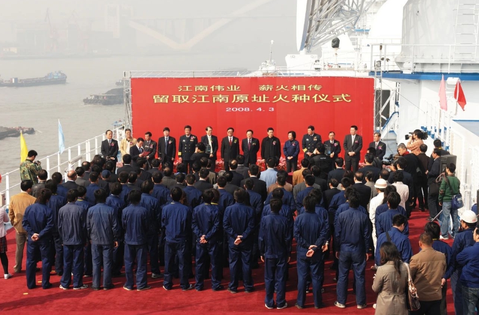 2008年4月,江南造船老廠建造的最后一艘船“遠(yuǎn)望6”號航天測量船即將交付。4月3日,時任江南造船搭載部部長黃文飛作為取火者從“遠(yuǎn)望6”號船前甲板的上建位置手拿焊槍取火引燃火炬。火炬依次傳遞至勞動模范、三八紅旗手、江南造船領(lǐng)導(dǎo)等,最后傳至?xí)r任中船集團總經(jīng)理陳小津手中并由他點燃了火種盒。6月3日,江南造船人親手建造的船舶特地趕回“娘家”,載著江南“火種”駛往新基地,為新建造的產(chǎn)品開工點火。