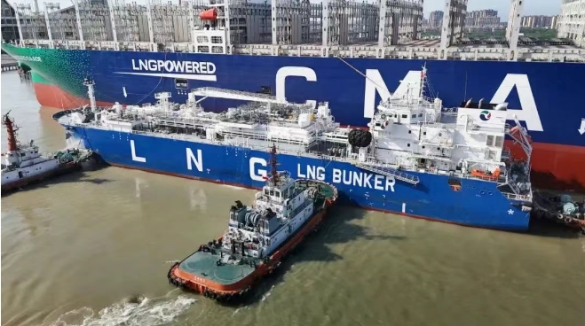 6月20日,全球首款江海直達型LNG加注船“淮河能源啟航”號在上海長興島順利完成對全球首艘23000TEU雙燃料超大型集裝箱船“達飛 雅克·薩德”號的LNG燃料補給作業。這兩艘不同領域的“冠軍”船舶均由中船集團旗下滬東中華建造,兩船首次“牽手”,為航運業綠色低碳發展留下佳話。