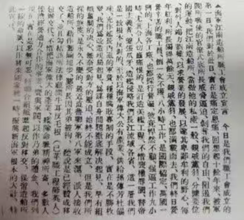 1927年3月21日,上海工人舉行第三次武裝起義,起義勝利后的第二天,在楊培生組織下,江南造船所職工會成立,并發布《職工會宣言》,揭露軍閥與官僚的反動面目,喚醒工人奮起斗爭。