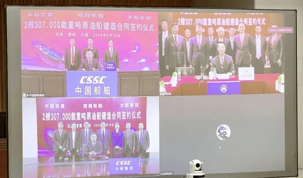 ????5月18日,中國(guó)船舶集團(tuán)旗下大船集團(tuán)、中船貿(mào)易與招商局集團(tuán)旗下招商輪船在北京、大連、香港三地以“云簽約”方式簽署2艘30.7萬(wàn)載重噸原油船建造合同。中國(guó)船舶集團(tuán)副總經(jīng)理孫偉、招商局集團(tuán)副總經(jīng)理王宏、招商輪船董事長(zhǎng)謝春林出席簽約儀式,中船貿(mào)易董事長(zhǎng)李洪濤、大船集團(tuán)總經(jīng)理?xiàng)钪局?、招商輪船總?jīng)理王永新代表各方在建造合同上簽字。