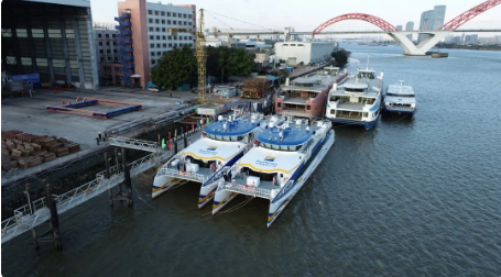 2020年12月30日,中國船舶集團(tuán)旗下遠(yuǎn)舟公司所屬英輝南方造船(廣州番禺)有限公司建造的“新海韻”號、“新海駿”號兩艘鋁合金雙體高速客船,同時(shí)在廣州市番禺區(qū)英輝南方碼頭順利交付。“新海韻”、“新海駿”是英輝南方為船東建造的藍(lán)色干線系列高速客船的第8和第9艘,船長42.8米,寬10.3米,載客199人,設(shè)計(jì)航速35節(jié)。遠(yuǎn)舟公司所屬英輝南方在鋁合金高速客船第三代船型基礎(chǔ)上,開展技術(shù)創(chuàng)新和船型優(yōu)化,開發(fā)完成了“新海韻”、“新海駿”為代表的第四代新船型。
