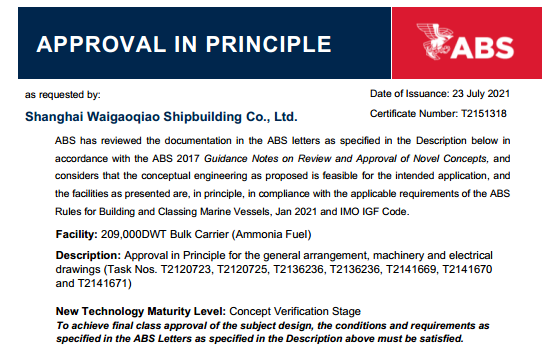 日前,中國船舶集團旗下外高橋造船自主研發(fā)設(shè)計的21萬噸氨燃料動力散貨船獲得美國船級社(ABS)頒發(fā)的原則性認可證書(AIP)。作為具有潛力的零碳燃料,氨燃料能滿足更加嚴格的溫室氣體排放要求,是未來脫碳航運業(yè)中最有希望的替代燃料之一。氨燃料動力船型的推出,為航運業(yè)提供一種零碳運輸?shù)沫h(huán)保新方案。