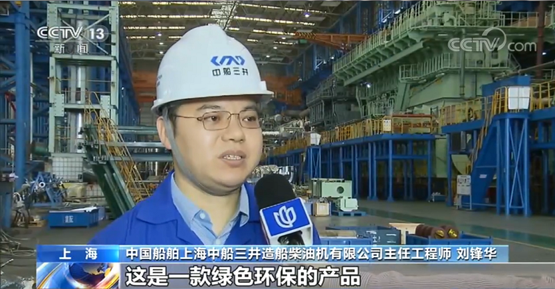 ????中國船舶上海中船三井造船柴油機有限公司主任工程師 劉鋒華:尺寸最大,達到了5層樓那么高,功率達到了63800多千瓦,功率也是最大的。這是一款綠色環保的產品,使用燃氣運行時氮氧化物的排放不到常規發動機的十分之一,硫氧化物和顆粒物的排放也是非常好的,不用裝任何后處理設備,都可以滿足IMO(國際海事組織)最新的排放法規要求。