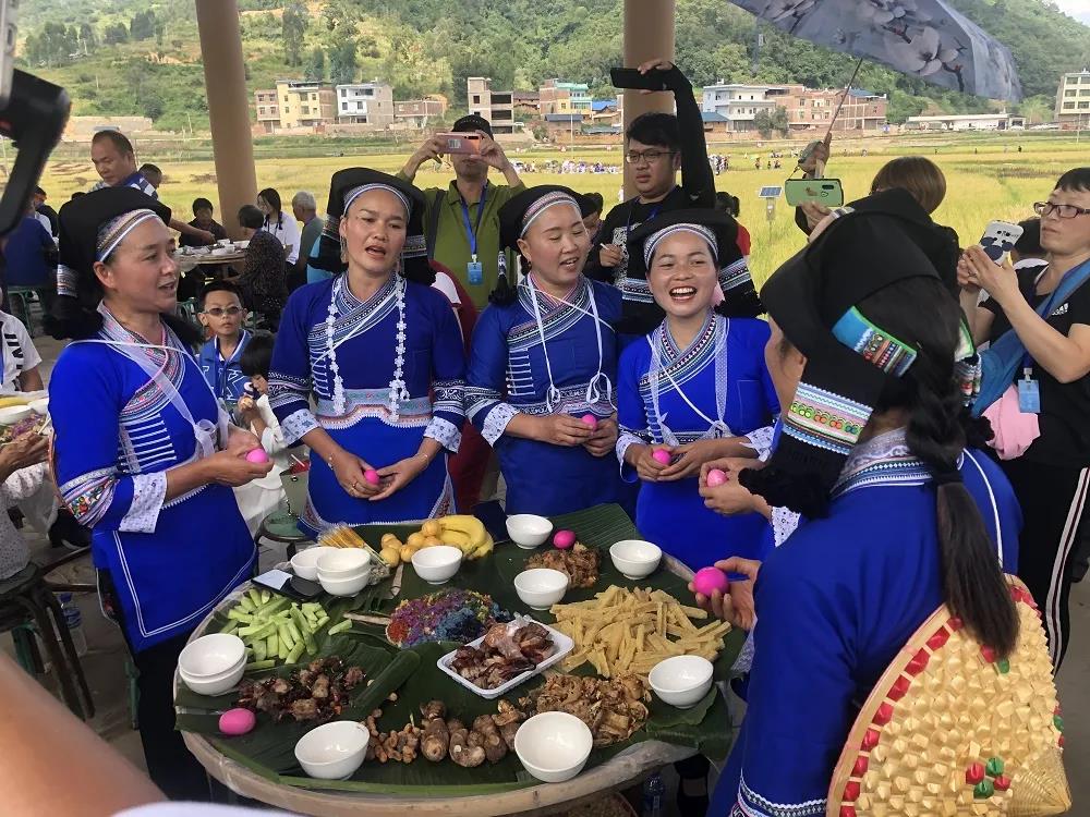 國(guó)家繁榮昌盛,人民生活幸福日子甜美。中午時(shí)分,現(xiàn)場(chǎng)壯鄉(xiāng)長(zhǎng)桌簸箕宴盛裝開席。喜悅的群眾對(duì)造型精巧、美妙絕倫的桑秋花米飯及平寨特色美食贊不絕口。一個(gè)個(gè)簸箕盛放的不僅是原生態(tài)健康美味,更是丘北壯鄉(xiāng)沉淀千年的魅力文化象征。