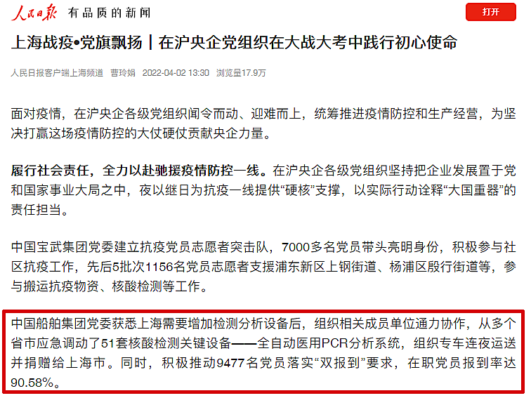 “中國船舶集團黨組獲悉上海需要增加檢測分析設備后,組織相關成員單位通力協作,從多個省市應急調動了51套核酸檢測關鍵設備——全自動醫用PCR分析系統,組織專車連夜運送并捐贈給上海市。同時,積極推動9477名黨員落實‘雙報到’要求,在職黨員報到率達90.58%。”
