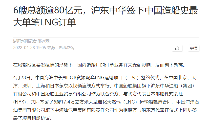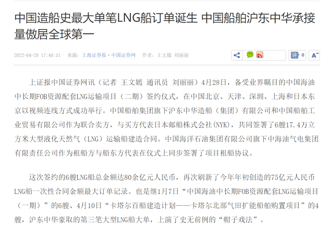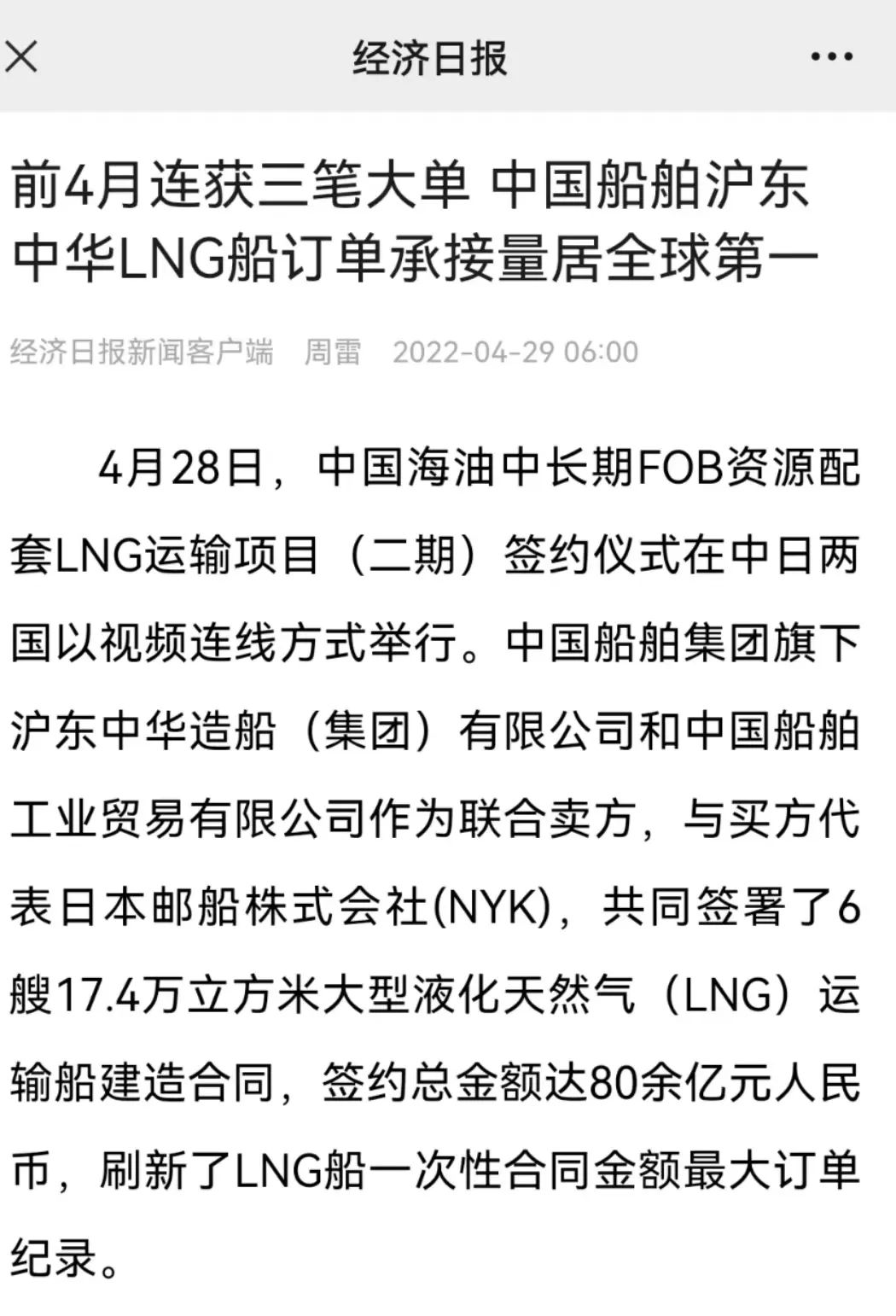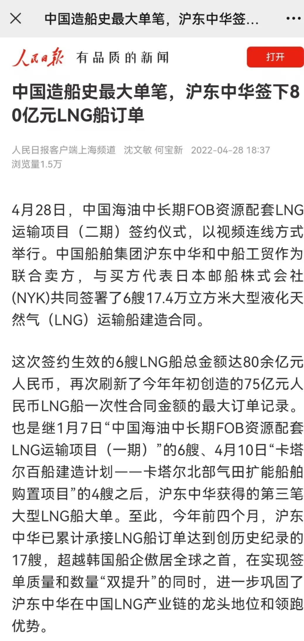 這次簽約生效的6艘LNG船總金額達80余億元人民幣,再次刷新了今年年初創(chuàng)造的LNG船一次性合同金額最大訂單紀(jì)錄。至此,今年前4個月滬東中華已累計承接LNG船訂單達到創(chuàng)歷史紀(jì)錄的17艘,超越韓國船企傲居全球之首,在實現(xiàn)簽單質(zhì)量和數(shù)量“雙提升”的同時,進一步鞏固了滬東中華在中國LNG產(chǎn)業(yè)鏈的龍頭地位和領(lǐng)跑優(yōu)勢。