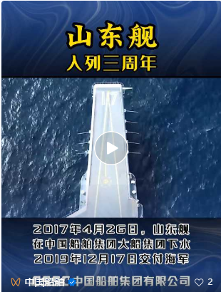 山東艦是我國第二艘航空母艦,也是我國自主設(shè)計(jì)、自主配套、自主建造的首艘航母。2017年4月26日,山東艦在素有“海軍艦艇搖籃”美譽(yù)的中國船舶集團(tuán)旗下大船集團(tuán)碼頭下水,自此揭開了中國雙航母時代篇章。