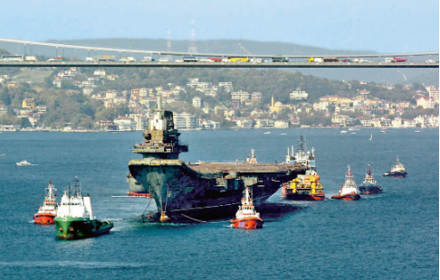 “瓦良格”號(hào)在11艘拖船拖行