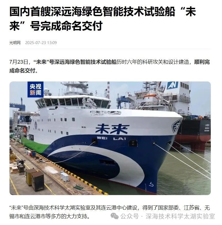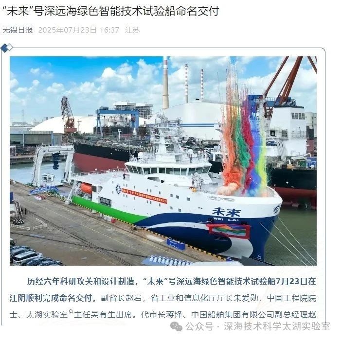 7月23日,由深海技術(shù)科學(xué)太湖實(shí)驗(yàn)室歷時(shí)六年科研攻關(guān)和設(shè)計(jì)建造的“未來(lái)”號(hào)正式命名交付。中船集團(tuán)旗下七〇二所、上船院、七〇四所、七一一所、七一二所等十余家單位共同參與技術(shù)攻關(guān)和配套供貨,中船澄西負(fù)責(zé)總裝建造人民日?qǐng)?bào)、新華社、央視新聞、科技日?qǐng)?bào)等主流媒體共同聚焦這一“國(guó)之重器”。