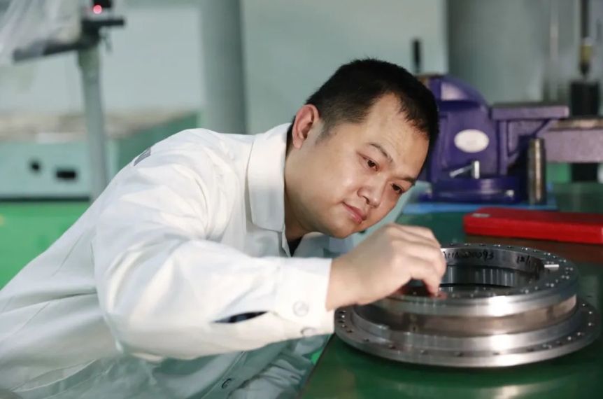 “必須持之以恒地以精益求精、精雕細琢的工匠精神打造所經(jīng)手的每個產(chǎn)品!”這是周虎常提的一句話。燃氣輪機機匣零組件制造精度要求高,裝配質(zhì)量控制嚴,其加工、裝配工藝技術代表機械制造行業(yè)的先進水平。武漢船機首套燃氣輪機機匣產(chǎn)品裝配工作由周虎帶領班組成員進行,其高超的技能水平保障了產(chǎn)品的裝配質(zhì)量與進度。在25兆瓦燃氣輪機過渡段機匣葉片裝配過程中,因葉片與機匣外環(huán)裝配為燕尾槽式的榫接結(jié)構,葉片榫頭與燕尾榫槽三面的接觸面積要求高達80%以上,需由鉗工拂配以達該指標。葉片榫頭拂配過程中,周虎采用銼刀銼削裝配面,利用其長期磨練掌握的良好手感,將銼削量誤差控制在0.005-0.01毫米,大大減少了葉片試裝配次數(shù),裝配效率顯著提升。